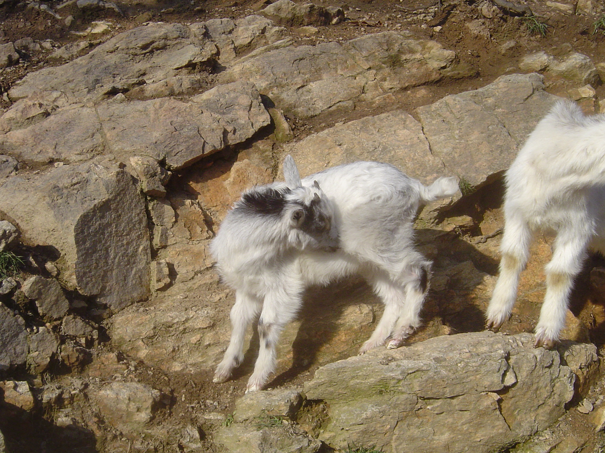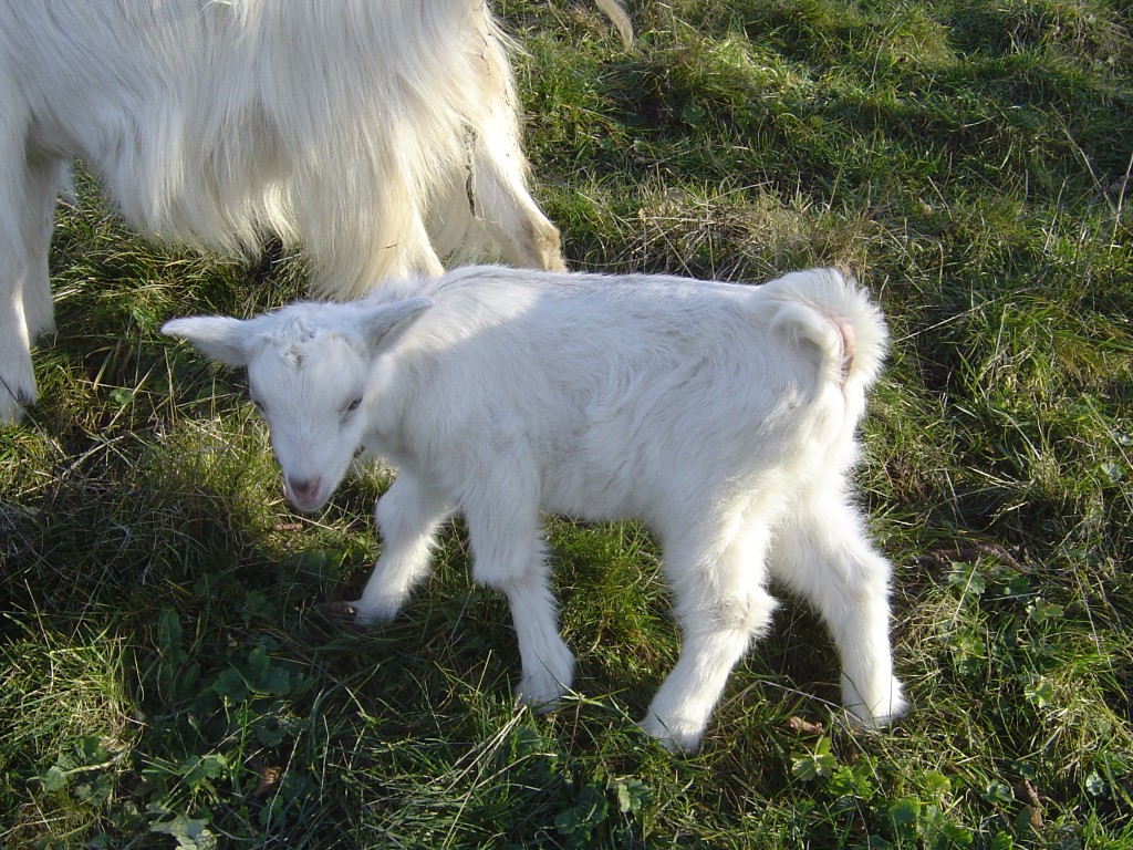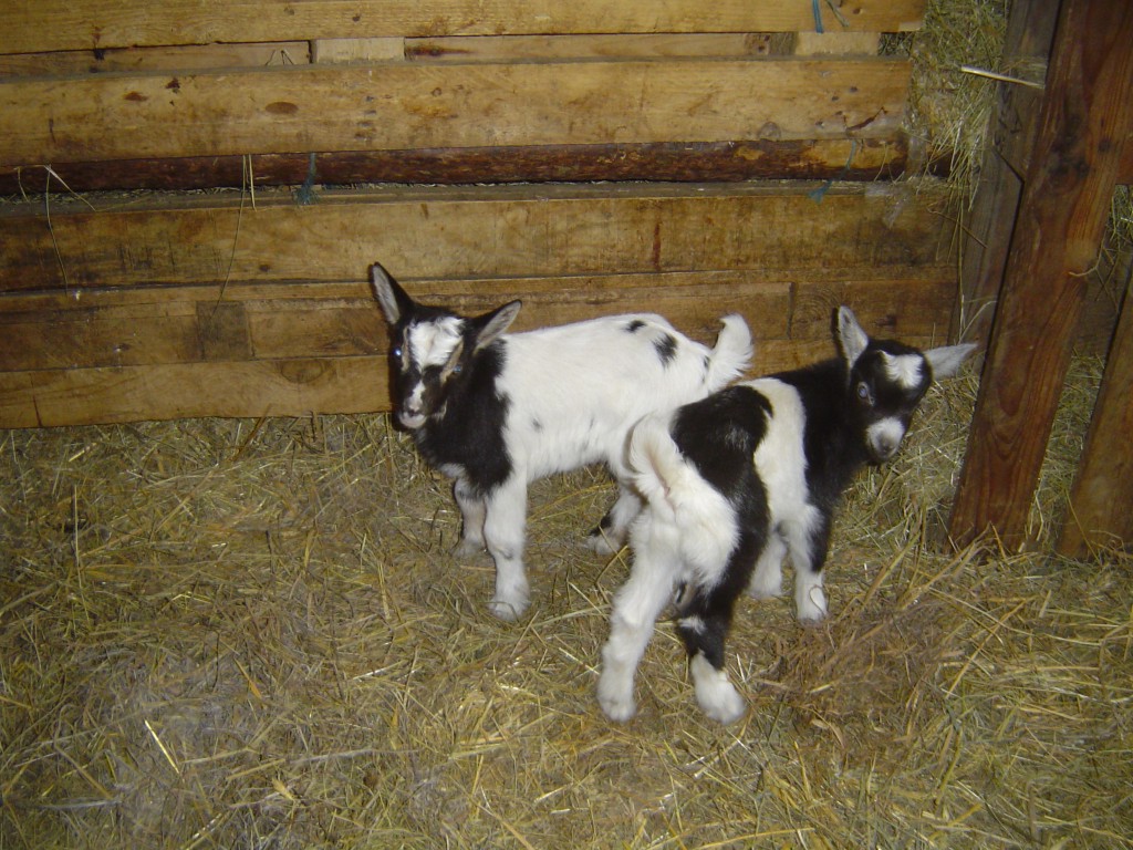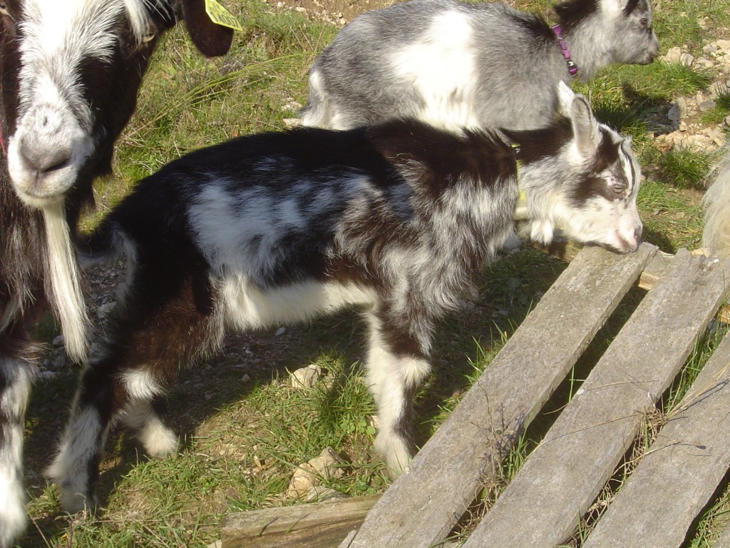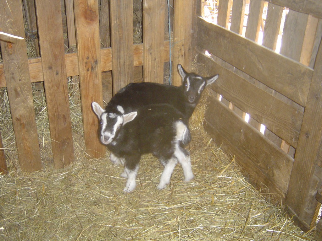 Une femelle (chevreau de gauche = beaucoup de blanc) Nom : Muguette , née de Libellule ; et Un mâle (celui de droite) Nom : Muguet , né de Lysaline.